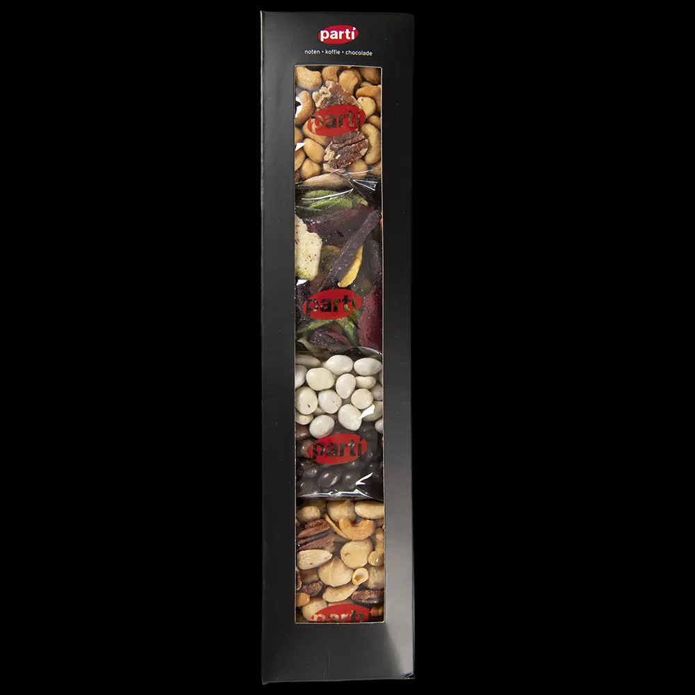 Een mooie box met groentechips, macadamiamix, chocoladepinda’s, notenmix.