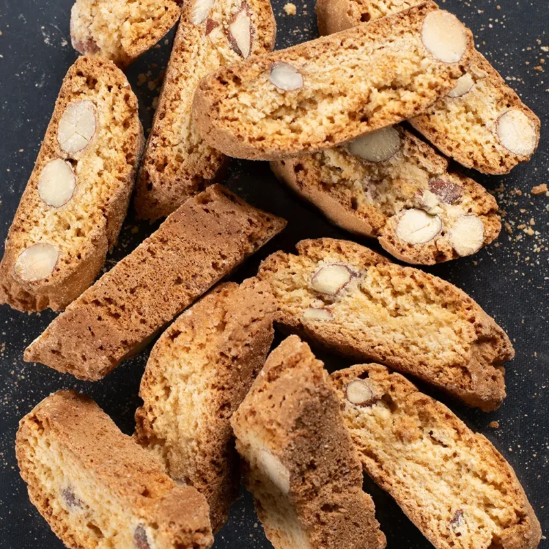 met deze knapperige amandelkoekjes en een heerlijke latte macchiato of cappuccino waant u zich in Italië. Cantuccini zijn ook lekker bij Partí chocolademelk of bij een glas vino santo, zoals de Italianen ze gebruiken. Van oorsprong komen de amandelkoekjes uit de provincie Prato, Toscane (Italië). De hardheid van de Cantuccini ontstaat doordat de koekjes twee keer worden gebakken. In een zakje van 130gr