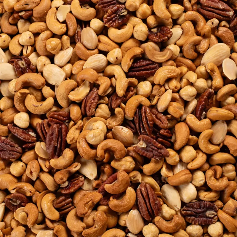 Cashew, pecan, amandelen, hazelnoten en indien gewenst zout. Gebrand in de arachideolie.