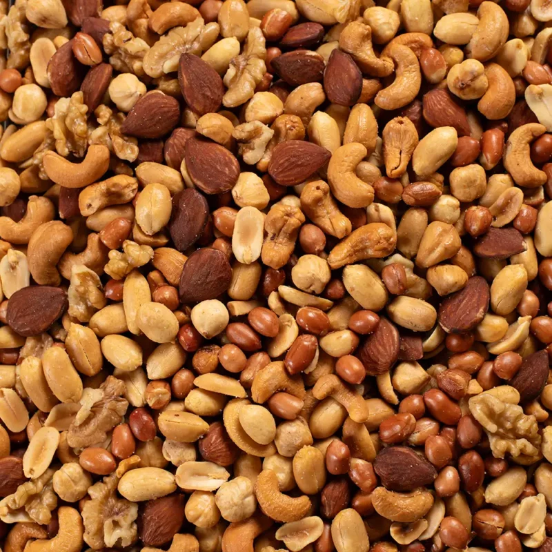 Pinda’s, cashewnoten, hazelnoten, amandelen, walnoten evt zout. Gebrand in arachideolie.