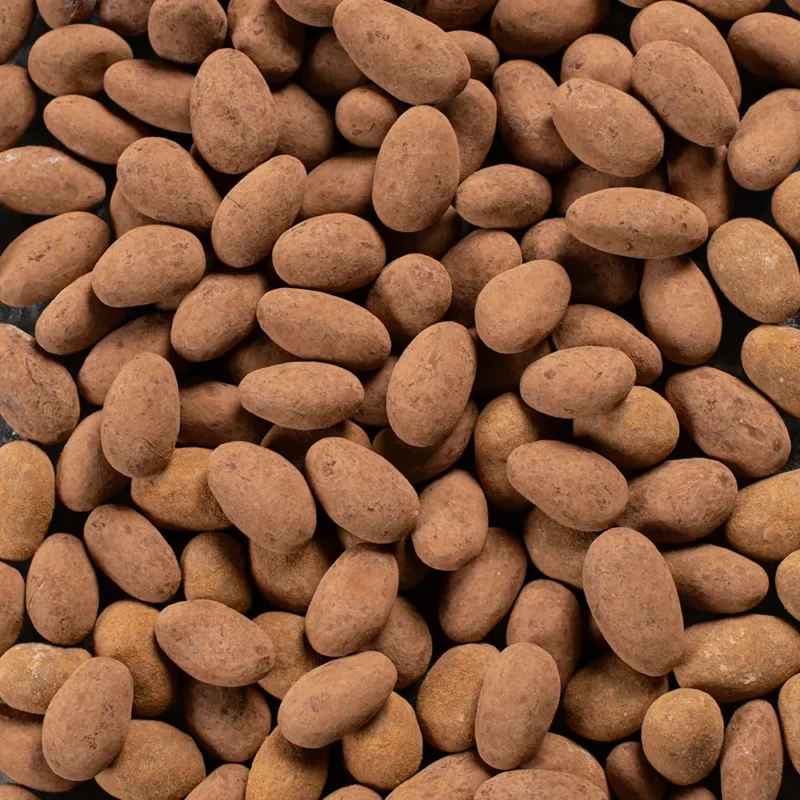 Amandelen in melkchocolade en bedekt met kaneelpoeder.