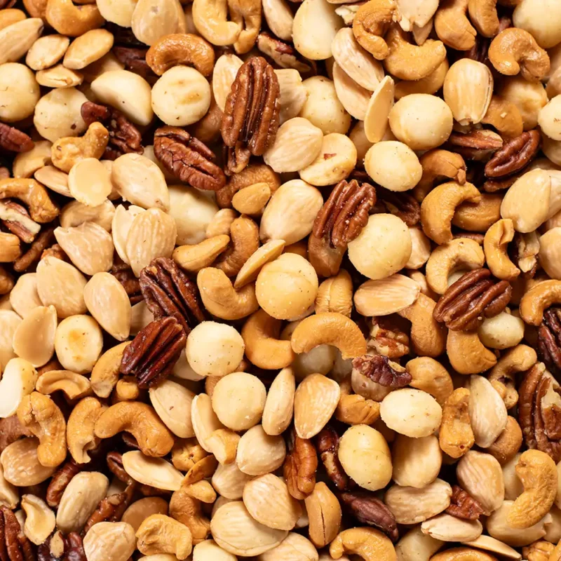 Veel macadamia’s, pecan, amandelen en cashew. Zonder pinda’s, dus vandaar dat dit onze meest luxe mix is. Kies gezouten of ongezouten.