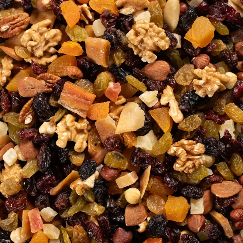 Amandelen, hazelnoten, walnoten, pecannoten, paranoten, rozijnen, abrikozen, papaja, ananas, cranberry’s, kersen, mango.