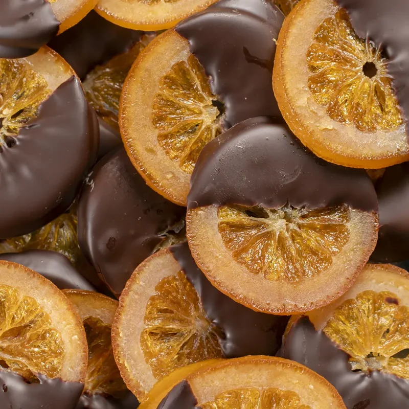Gekonfijte sinaasschijfjes in heerlijke Belgische Callebaut chocolade.