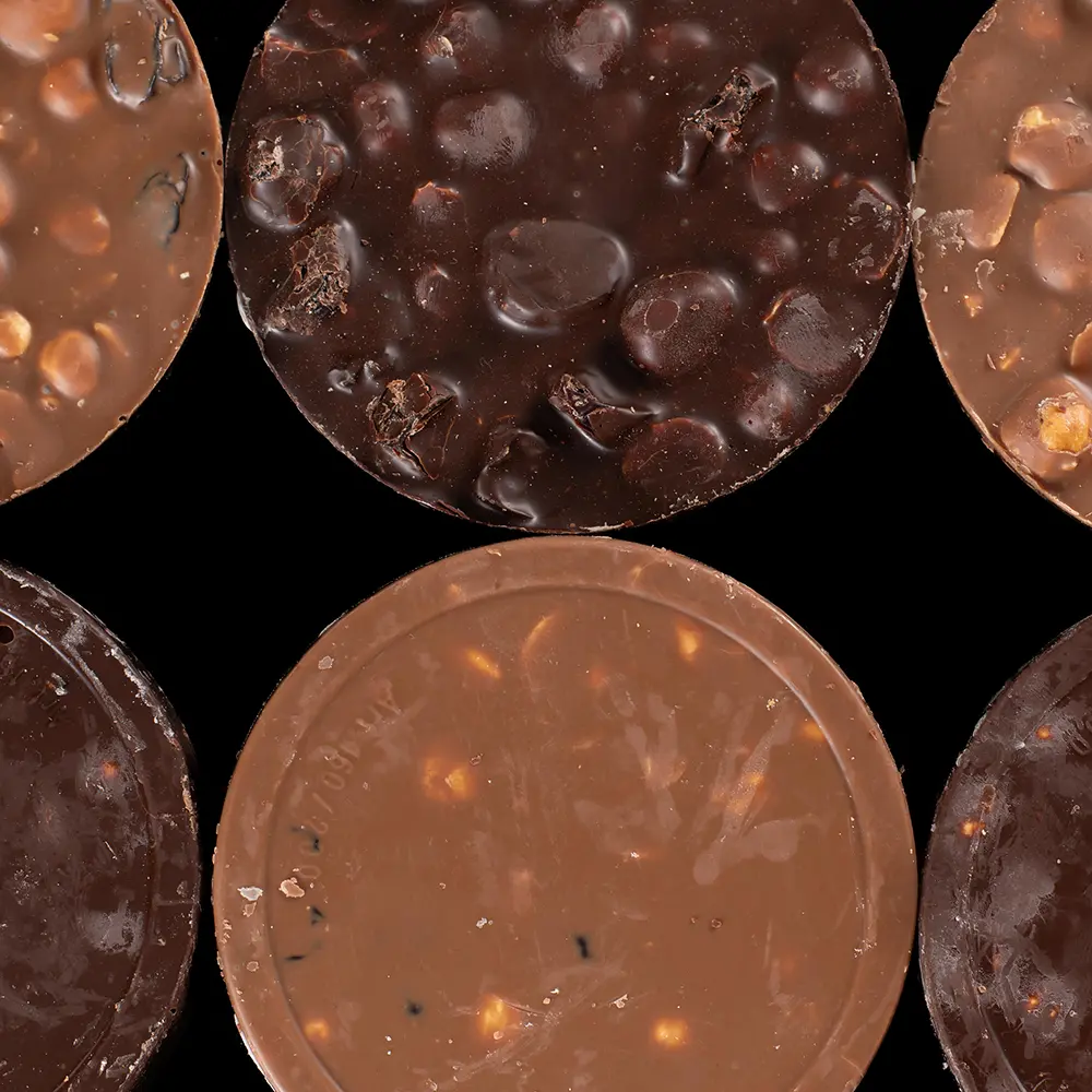 Chocolade puur (cacaomassa, suiker, magere cacaopoeder, emulgator: sojalecithine, natuurlijk vanille aroma) hazelnoten en rozijnen
